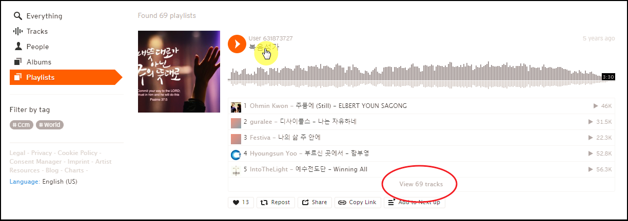 영어로 되어 있어서 당황하시는 분들도 계실 수 있는데요. 그럴 필요 없습니다. 사운드 클라우드 사이트에서 복음성가 무료듣기 방법은 간단합니다.