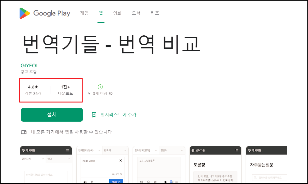 ▲ 지금까지 이용한 번역기 사이트에서 제공하는 서비스를 스마트폰에서도 이용하는 것이 가능합니다. 구글 플레이 스토어에서 검색하면 찾을 수 있는데요. 잘 알려진 서비스가 아님에도 불구하고, 많은 사람이 다운로드 받고, 높은 평점을 준 것이 눈에 띄네요. 그럼 잘 활용하셔서 좋은 성과 내시길 바랍니다.