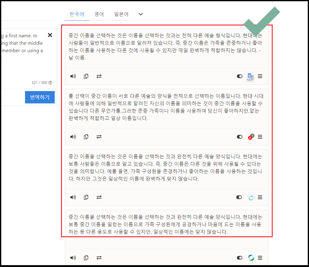 여러 개의 번역기에서 우리가 입력한 영어문장을 번역한 결과를 확인해보고, 바로 비교해서 가장 나은 결과만 선택하면 되기 때문이죠.