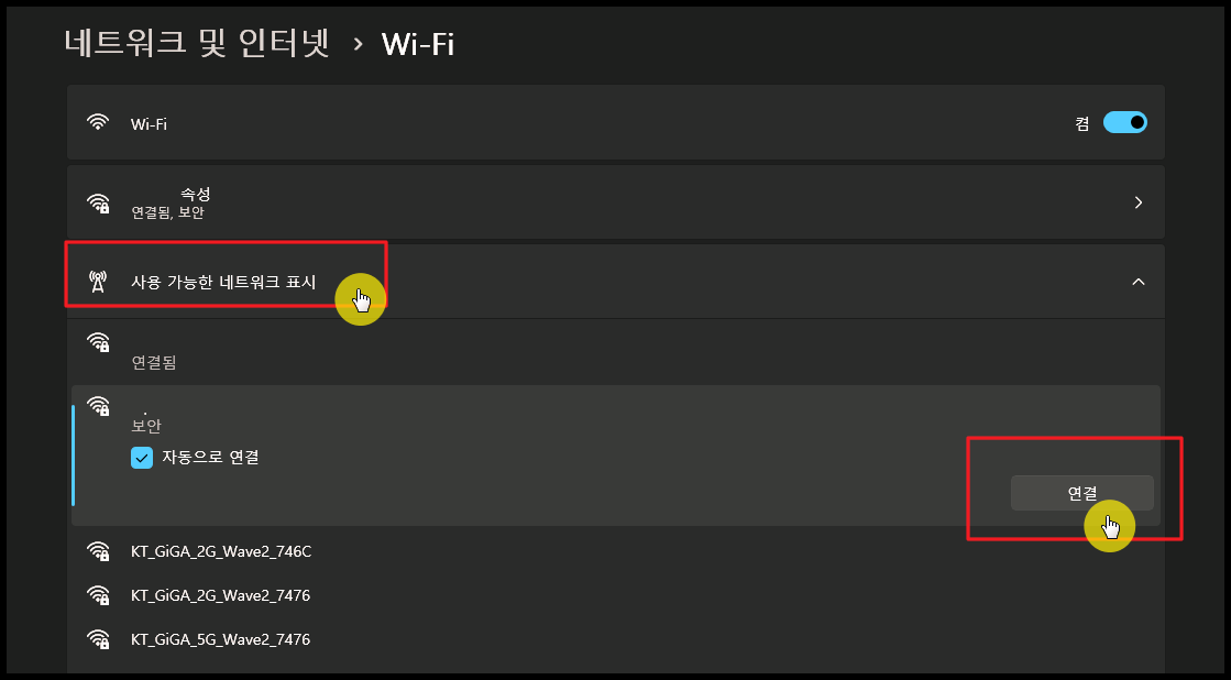 그 다음 "사용 가능한 네트워크 표시" 버튼을 누릅니다. 그럼 그 아래에 여러 가지 와이파이 공유기가 나타나는데요. 여기에서 자신이 사용하는 공유기를 선택한 후 연결 버튼을 누릅니다. 이렇게 하면 무선으로 컴퓨터 네트워크 연결을 하실 수 있습니다.