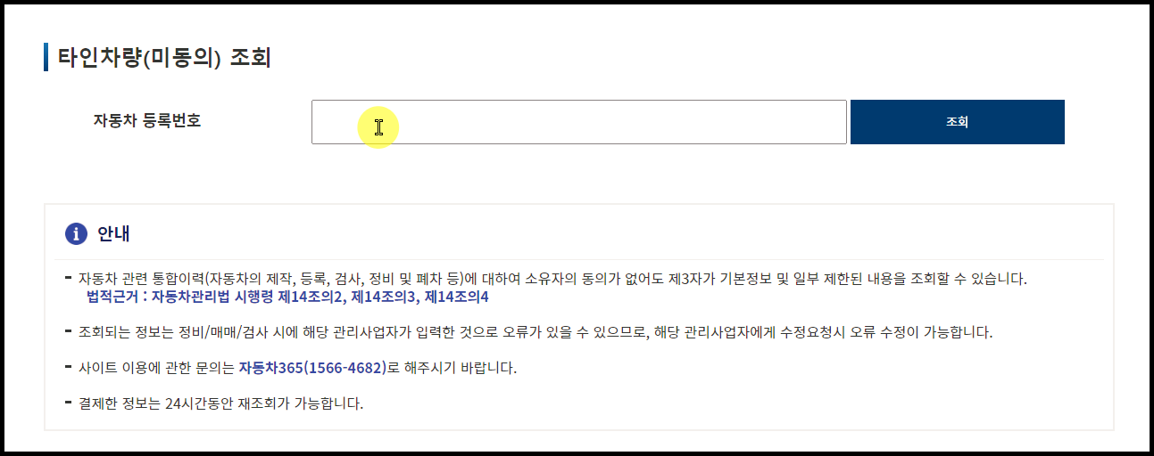 ▲ 타인차량에 대하여 동의를 받지 않은 상태에서도 조회를 할 수 있는데요. 이 경우에는 해당 자동차의 등록번호를 알고 있어야 합니다. 조회되는 정보로는 정비, 매매, 검사를 진행할 때 해당 관리 사업자가 입력한 것입니다. 오류가 있을 수 있기 때문에 이 점을 감안해서 살펴보시는 것이 좋습니다.