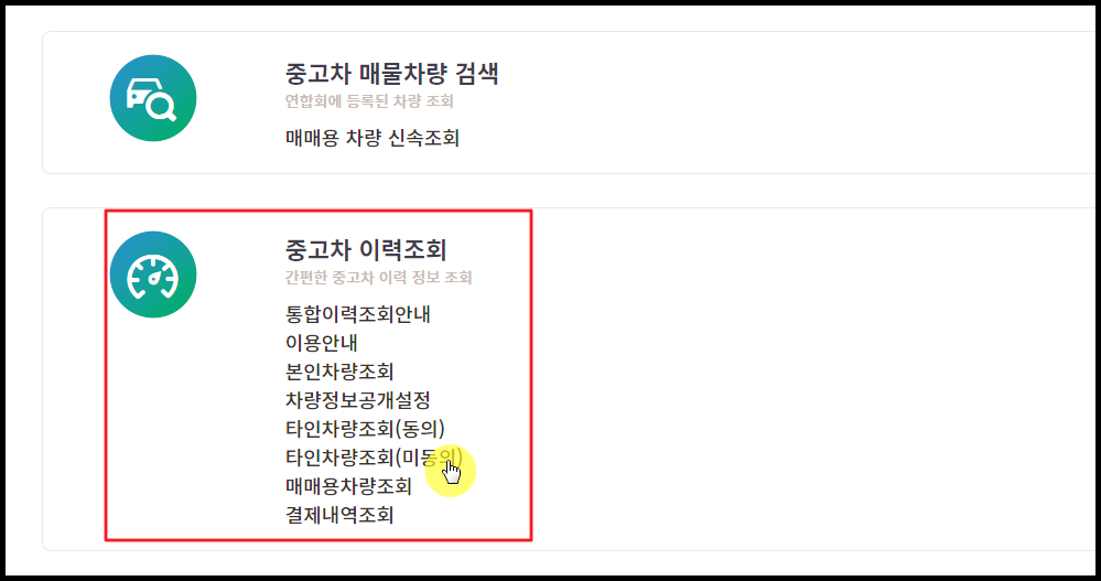 ▲ 중고차를 사거나 팔려고 할 때 도움이 되는 서비스가 여러 가지 나타나는데요. 가장 먼저 중고차 매물차량을 조회하는 메뉴가 있고요. 그 다음에는 여러 가지 이력을 확인해볼 수 있는 메뉴가 나타납니다. 본인 및 타인의 차량에 대한 조회를 할 수 있도록 되어 있죠.