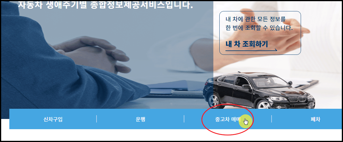 ▲ 다음 페이지가 열리면 메뉴를 통해 신차구입, 운행, 중고차 매매, 폐차 서비스를 찾을 수 있는데요. 차량번호 조회를 하고 싶다면 여기에서는 "중고차 매매"를 선택해 주세요..