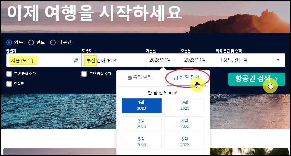 사이트에 접속하면 출발지는 서울, 도착지는 부산 그리고 좌석 등급 및 승객 정보를 입력해 주세요. 가는날과 오는날의 경우에는 한 달 단위로 선택해 주세요. 이렇게 해야 어느 날에 비행기 요금이 가장 싼지 알 수 있거든요.