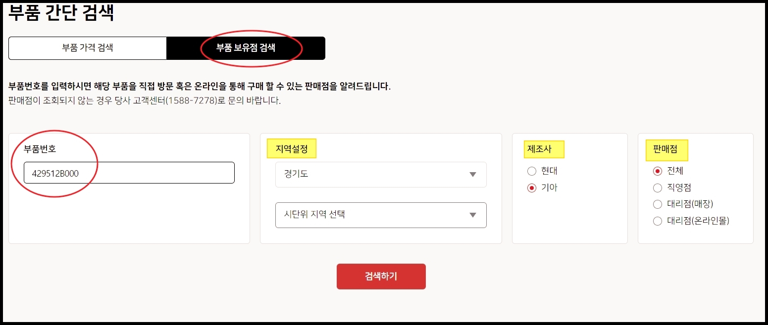 ▲ 좋게 고유번호를 중심으로 보유점을 검색할 수 있는 화면이 나타납니다. 해당 부품을 구매할 수 있는기아자동차의 직영점이나 대리점을 찾을 수 있습니다. 온라인몰도 검색이 가능하기 때문에 인터넷으로 구입이 가능해요.