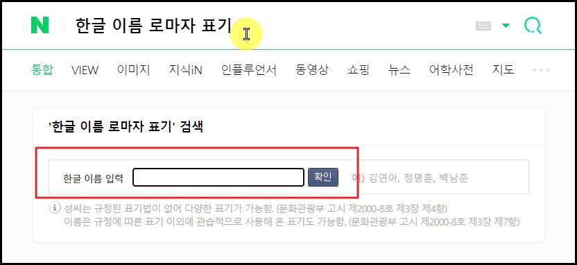 이번에는 한글에서 영문으로 변환하는 방법을 알려 드리겠습니다. 이 부분을 어려워하는 분들이 많은데요. 아주 편리하게  변환하는 일을 하도록 도와주는 서비스가 있어요. 네이버에 한글 이름 로마자 표기 서비스인데요. 간단한 검색을 통해 해당 서비스를 찾을 수 있습니다.