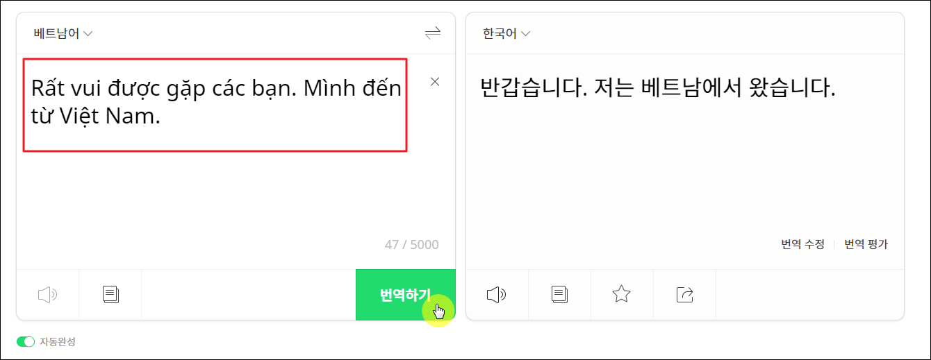 "반갑습니다 저는 베트남에서 왔습니다"라는 문장을 좌측 영역에 입력한후, 번역하기 버튼을 눌러 보았습니다. 이에 따라 오른편에 있는 한국어 문장으로 결과를 받아보았는데요. 정말 깔끔하게 제대로 된 번역기 결과를 받아 볼 수 있었습니다.