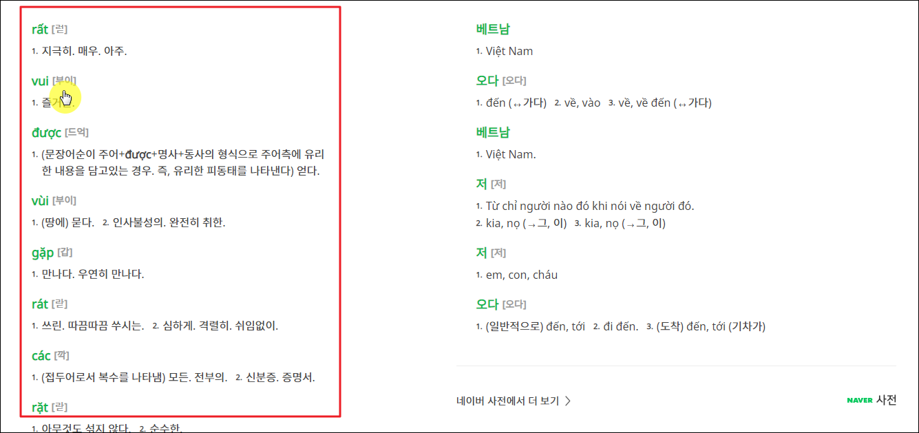베트남어 번역기 서비스 바로 아래에 있는 여러 가지 단어가 나타납니다. 베트남어 단어와 한국어 단어인데요. 이를 통해 베트남어를 학습하기에 정말 좋습니다. 반대로 베트남 사람이 한국어를 공부하기에도 정말 좋죠. 여기서 궁금한 단어를 하나 선택하면 좀더 상세하게 해당 단어에 대한 뜻을 알아 볼 수 있어요.