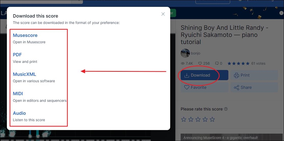 저는 사카모토 류이치의 '샤이닝 보이 앤드 리틀 랜디'라는 제목을 가진 곡의 무료 악보를 찾았습니다. 정말 감미로운 곡인데요. 뮤즈스코어 화면에서 좌측 상단에 보면 재생 버튼이 있습니다. 우리가 찾은 곡을 바로 들어볼 수 있도록 해주는 기능이죠. 우리가 직접 연주를 하지 않아도 사이트 상에서 이렇게 미리 들어 볼 수 있어요.