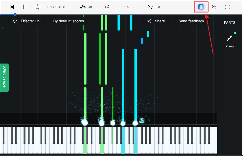 여러 가지 기능 중에서 최근에 추가된 기능을 하나 알려 드릴게요. 사이트 화면 우측 상단에 보면 피아노 건반 모양의 버튼이 있는데요. 이 버튼을 눌러 보세요. 그럼 연주하는 피아노 건반의 영상을 볼 수 있어요.