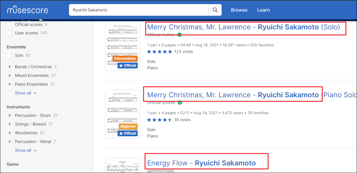 제가 좋아하는 사카모토 류이치가 만든 곡의 이름을 검색해 보았습니다. 수십 개 나오는데요. 여기서 자료를 얻고 싶은 곡을 선택해주세요.