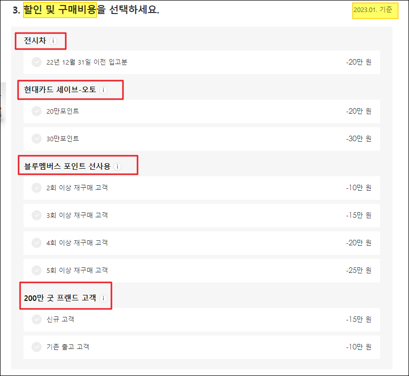 ▲ 이번에는 신차 판매조건 중에서 본인이 이용할 수 있는 조건을 선택해야 하는데요. 여기서 선택하면 최종 가격표에 자동으로 반영이 돼요.