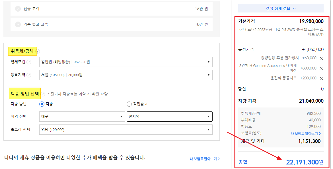 ▲ 마지막으로 면세조건, 등록지역, 탁송 지역, 출고장에 대한 정보를 입력해 주세요. 그럼 신차로 현대 상용차를 구입할 때 추가로 발생하는 비용인 취득세, 공채비용, 탁송료를 자동으로 계산해줘요.