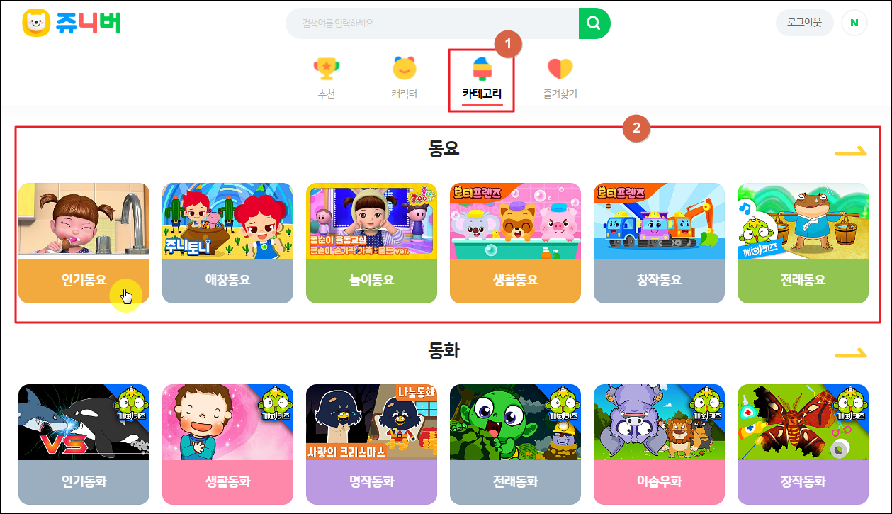 ▼ 쥬니버 사이트에 접속했습니다. 메뉴에 있는 카테고리를 선택해 보세요. 그럼 여러 가지 동요를 선택할 수 있는데요. 엣날부터 전해 내려온 전래동요는 물론이고, 놀이나 생활에 관련된 곡, 애창곡 및 인기곡 등 다양한 버전의 동요듣기를 무료로 진행할 수 있습니다.