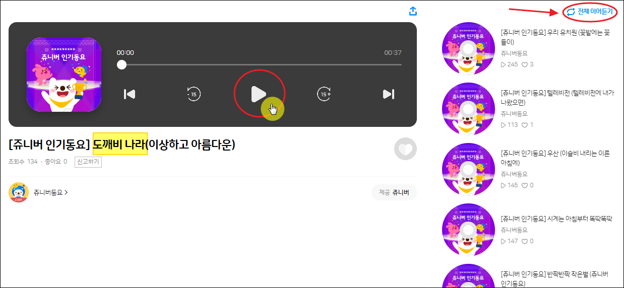 ▼ 저는 바나나에 관련된 동요를 선택했는데요. 조회수가 12,395회나 될 정도로 많은 아이들에게 사랑 받은 노래입니다. 한 곡에 대한 재생이 끝나면 다른 곡으로 이어서 계속 재생이 되도록 할 수 있는데요. 그렇게 하기 위해서는 사이트 화면에서 우측 상단에 있는 버튼을 눌러 "전체 이어보기"로 변경해주면 돼요. 그럼 일일이 동요나라 곡을 선택하는 수고를 줄일 수 있습니다.