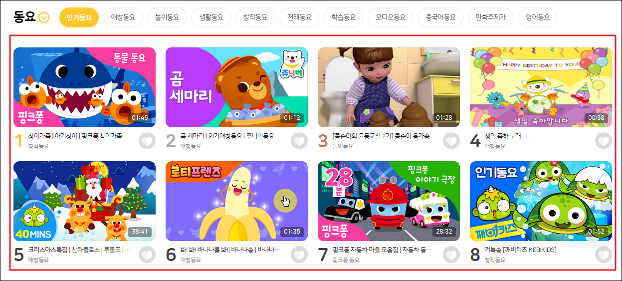 ▼ 이곳에서 제공하는 동요나라 컨텐츠는 다양한데요. 일단 인기 순서로 보면 거의 모든 아이들이 좋아하는 상어가족, 곰 세마리, 콩순이의 율동송인 응가송, 생일 축하 노래, 산타클로스, 자동차 마음 모음집, 거북송 등 많이 있어요. 모두 무료로 들을 수 있는데요. 요즘에는 전래동요보다 이렇게 현대식으로 제작된 동요나라 컨텐츠의 인기가 좋아요.