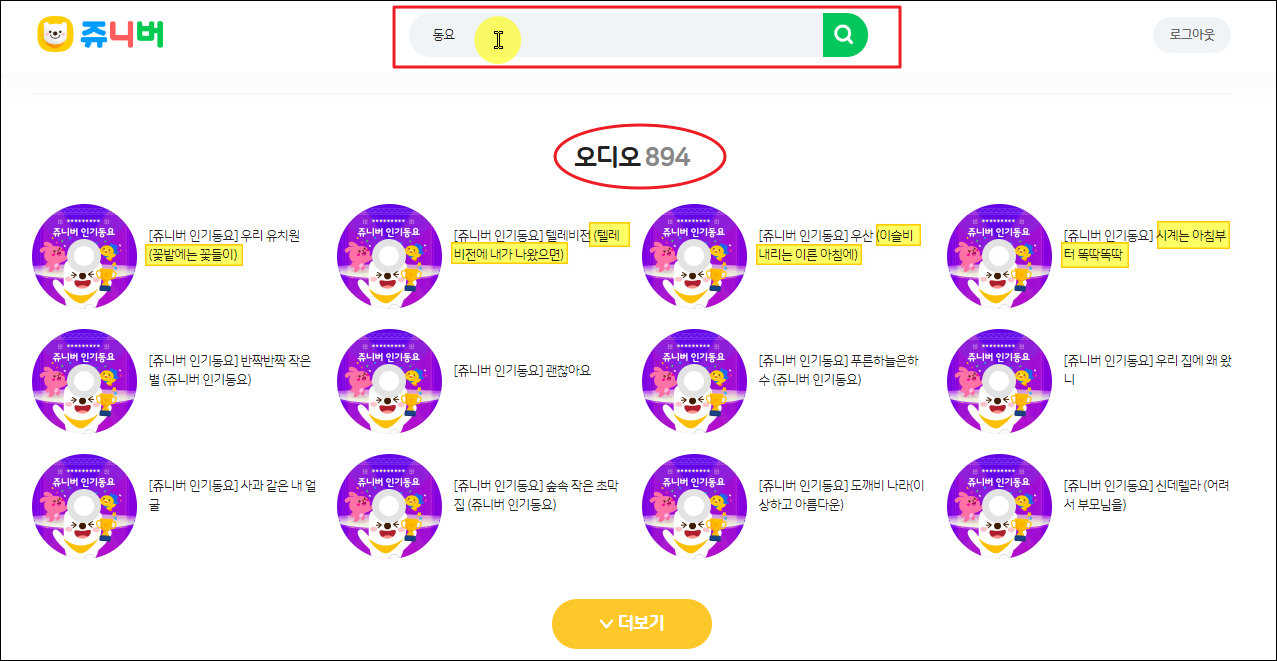 쥬니버 사이트의 검색창에 "동요"를 입력한 후 엔터키를 눌러보세요. 그럼 894개의 동요나라 오디오 컨텐츠가 나타납니다. 영상 없이 아이에게 들려주고 싶은 곡을 찾을 때 이용하면 좋아요. 유치원에서 많이 듣고 배우는 곡이 많은데요. '꽃밭에는 꽃들이', '텔레비전에 내가 나왔으면', '이슬비 내리는 이른 아침에', '시계는 아침부터 뚝딱뚝딱', '반짝반짜 작은별' 등 동요나라에서 만나보았던 컨텐츠를 모두 만나볼 수 있습니다.
