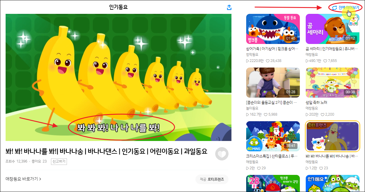 저는 바나나에 관련된 동요를 선택했는데요. 조회수가 12,395회나 될 정도로 많은 아이들에게 사랑 받은 노래입니다. 한 곡에 대한 재생이 끝나면 다른 곡으로 이어서 계속 재생이 되도록 할 수 있는데요. 그렇게 하기 위해서는 사이트 화면에서 우측 상단에 있는 버튼을 눌러 "전체 이어보기"로 변경해주면 돼요. 그럼 일일이 동요나라 곡을 선택하는 수고를 줄일 수 있습니다.