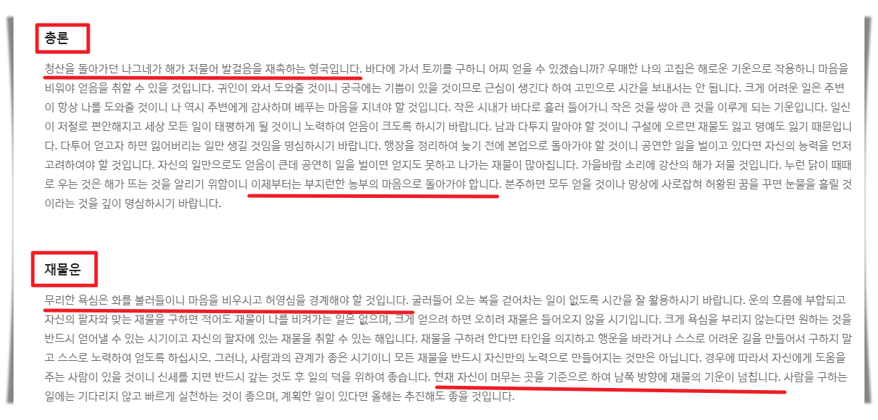 재물운의 경우에는 경제와 관련이 있는데요. 부자가 되고 싶은 분들은 이 부분은 꼼꼼히 살펴보는 것이 좋겠네요.
