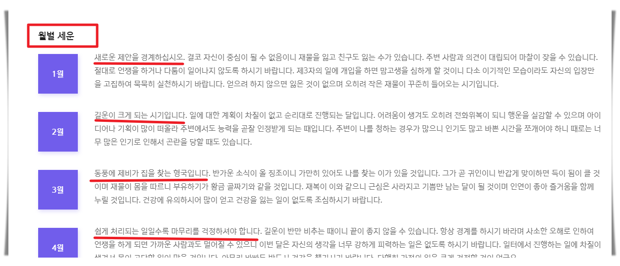 더하여 2023년에 속하는 월마다 운세 풀이를 보는 것도 가능합니다.
