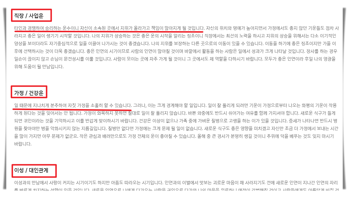 이 밖에도 직장 및 사업운, 가정 및 건강운, 이성 및 대인관계에 대해 알아볼 수 있는데요.