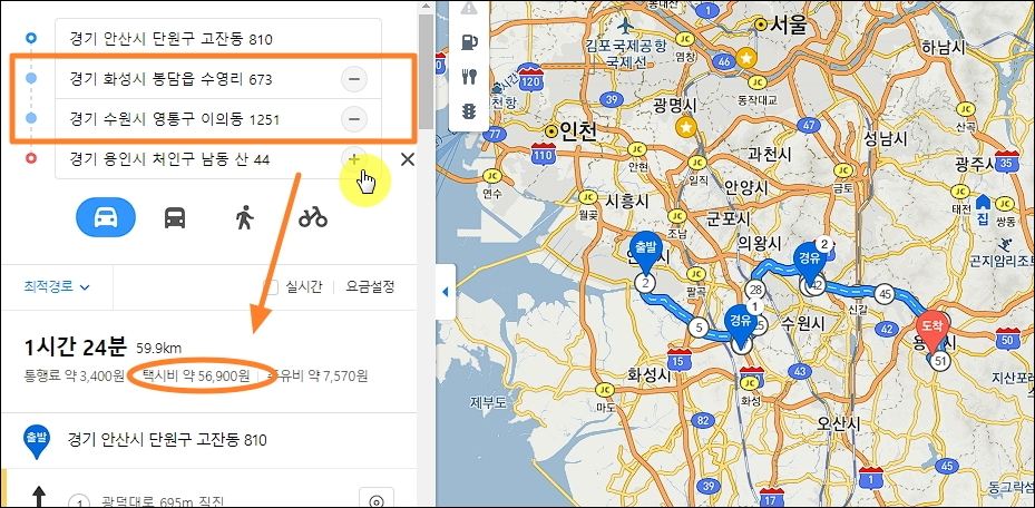 택시를 이용할 때 자주 있는 일은 아니지만, 일정 구간을 경유해야 할 때가 있습니다. 이럴 때에는 지도 화면에 마우스로 클릭을 해보세요. 그럼 경유지 설정이 가능합니다. 또는 좌측에 있는 출발지와 도착지를 입력하는 부분에서 [플러스] 버튼을 누른 후 경유지를 추가하면 됩니다. 이렇게 경유하는 곳이 늘어나면 이에 대한 이동거리, 이동시간, 택시요금이 자동으로 계산되어 계산기 결과에 표시가 됩니다.