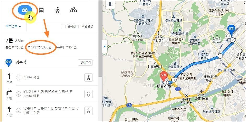 [길찾기] 버튼을 누르면 출발지에 "강릉역"이 입력이 되어 있을 거에요. 입력이 되어 있지 않다면 직접 입력해 줍니다. 그 다음 바로 아래에 도착할 위치를 입력해 주세요. 이번에는 "강릉시청"을 입력해 보겠습니다. 이렇게 하면 강릉역에서 강릉시청으로 갈 때 얼마의 택시요금이 발생하는지 알 수 있어요.
