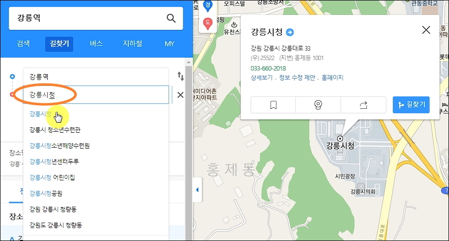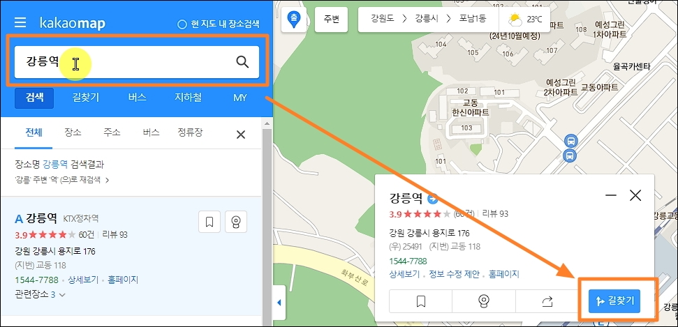 카카오앱을 실행하거나 사이트에 접속했을 때 가장 먼저 해야 할 일은 출발 위치를 지정하는 일입니다. 검색창에 관련 키워드를 입력해보세요. 저는 "강릉역"을 입력해 보았는데요. 이렇게 자세한 주소를 몰라도 주요명칭을 통해 위치 지정이 가능합니다. 지도 화면에 나타난 검색 결과에서 [길찾기] 버튼을 눌러주세요.