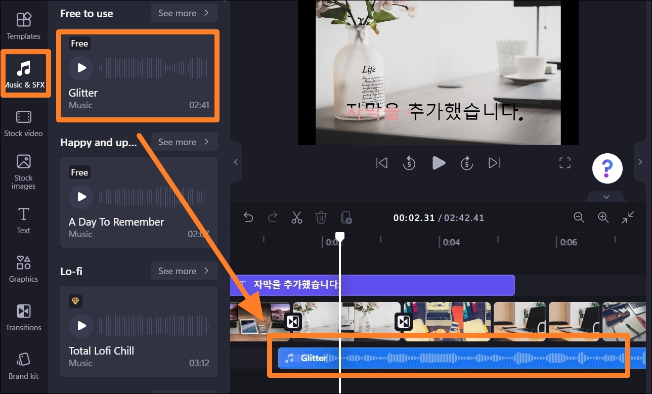이번에는 MUSIC & SFX 메뉴를 선택해 보세요. 사진으로 만든 동영상에 손쉽게 배경음악을 넣을 수 있는데요. 무료로 사용할 수 있는 음원을 제공하고 있어서 좋아요.