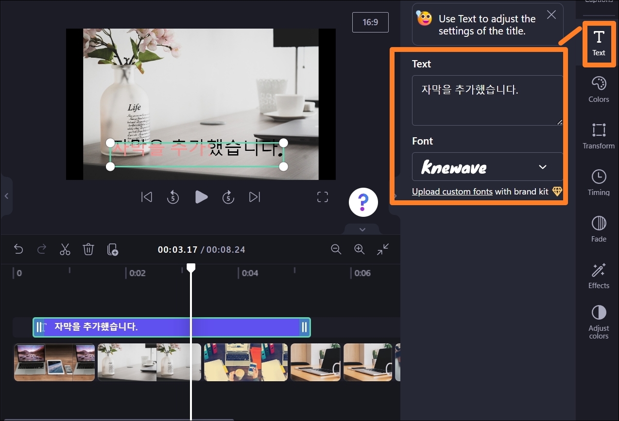 방금 추가한 자막에 대한 내용을 변경하고 싶을 때에는 우측에 있는 텍스트 메뉴를 선택합니다. 기존에 있던 내용을 지운 후, 나타내고자 하는 내용을 입력해 주세요. 폰트를 바꾸거나 글씨에 색이나 자막의 위치를 변경하는 것이 가능합니다.