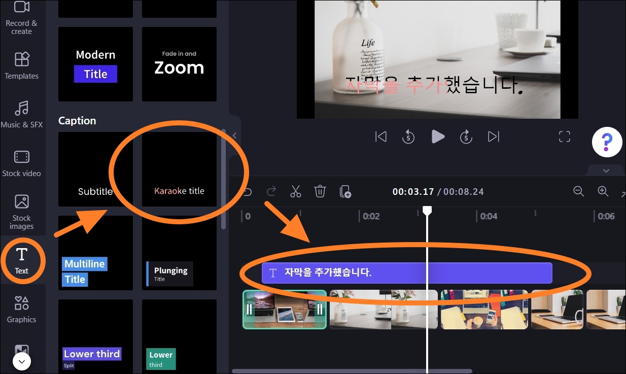영상을 통해 하고자 하는 말이 있으면 자막을 추가하는게 좋겠죠. 클립챔프에서 맨좌측 영역을 살펴보면 텍스트 메뉴가 있습니다. 해당 메뉴를 통해 선택하면 여러가지 자막 디자인이 나타나는데요. 이 중에서 하나를 선택하여 타임라인으로 옮겨 보세요. 자막이 시작하는 부분에서 끝나는 구간까지 손쉽게 접할 수 있습니다.
