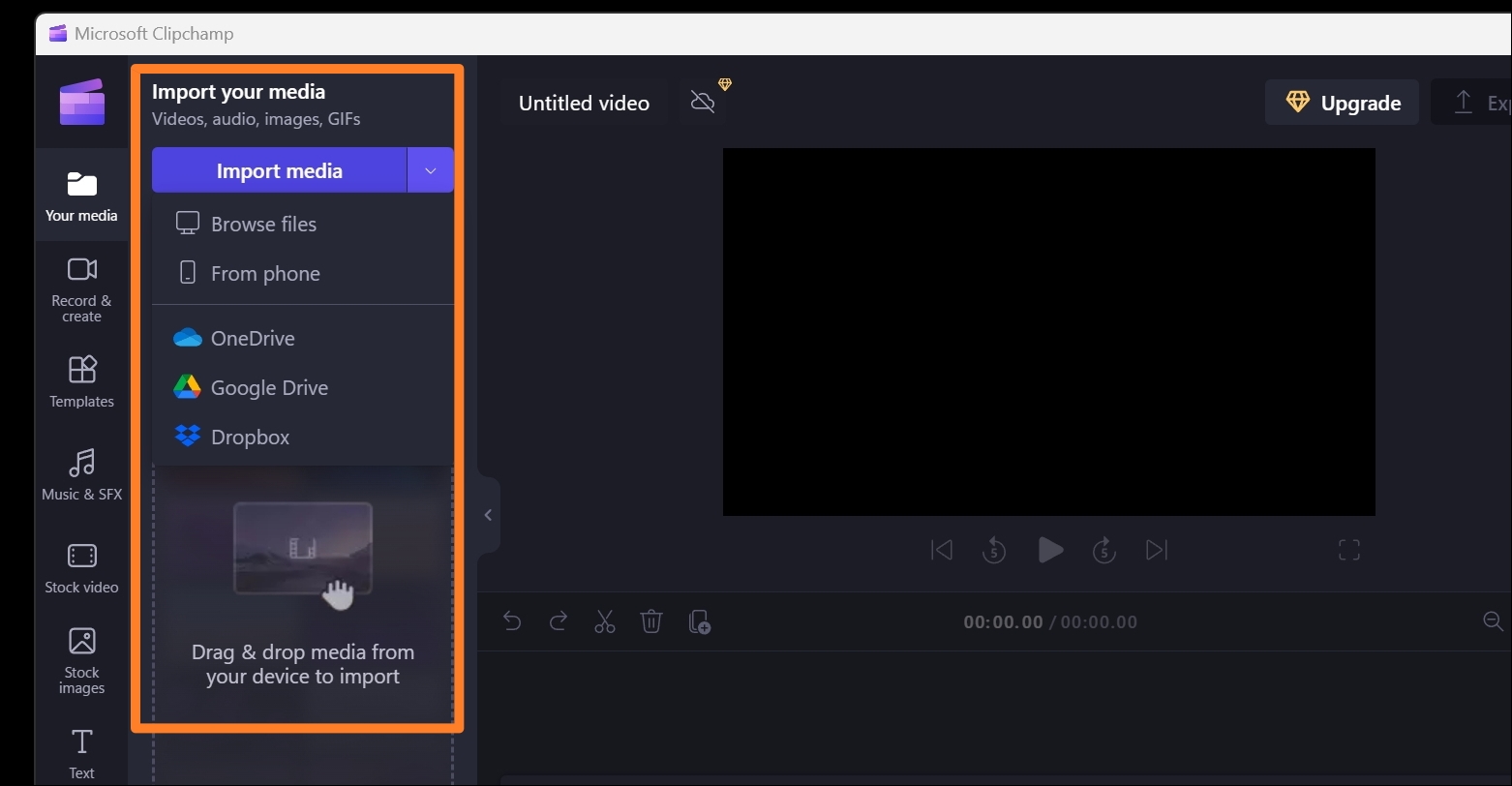클립챔프의 편집 화면이 나타났습니다. Import media 버튼을 눌러 주세요. 그 다음 동영상에 넣을 사진 파일을 모두 추가합니다. 참고로 사진 외에 동영상이나 음악 파일도 추가할 수 있어요.