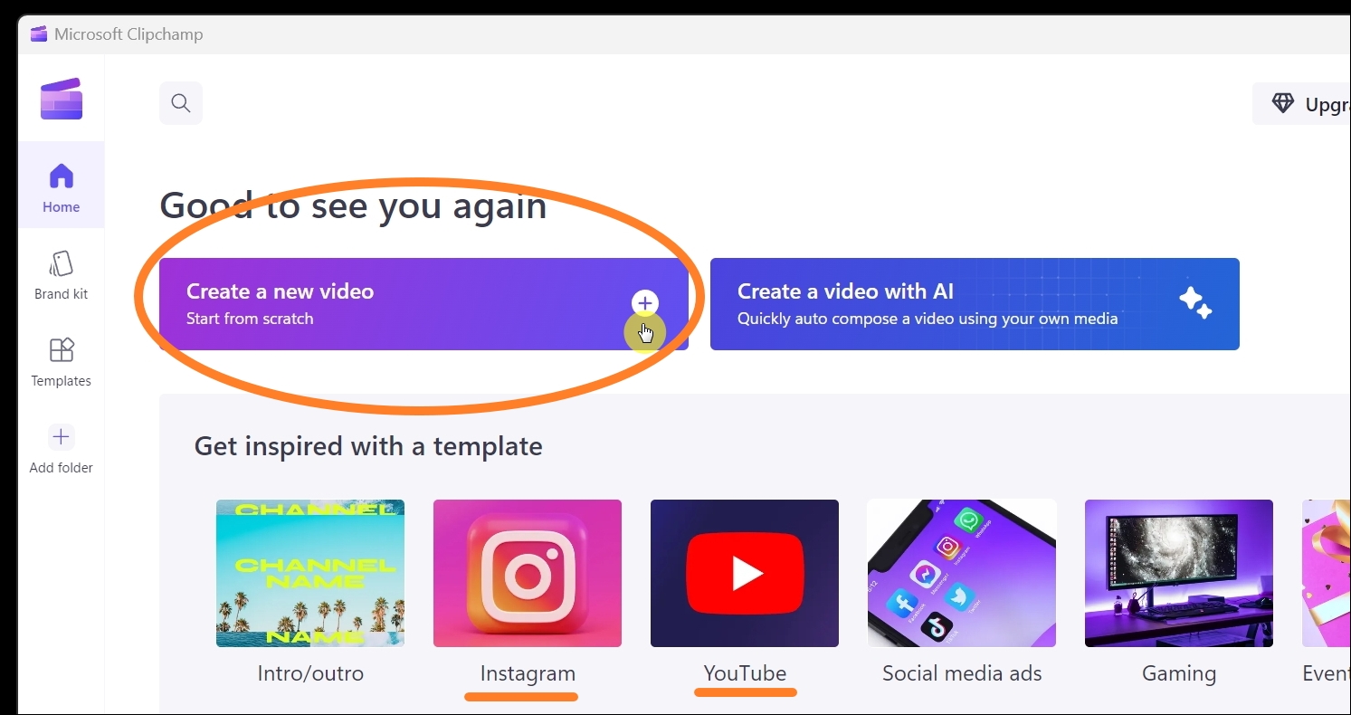 해당 프로그램을 처음 실행하면 다음과 같은 시작 화면이 나타납니다. 여기에서 뉴비디오 버튼을 누르면 되는데요. 바로 옆에 있는 위드 AI 버튼을 선택하면 AI를 이용한 동영상 만들기 진행이 가능합니다. 그 아래 있는 여러 가지 템플릿을 통해 인스타그램, 유튜브 등을 타겟으로 하는 동영상을 손쉽게 만들수 있습니다.