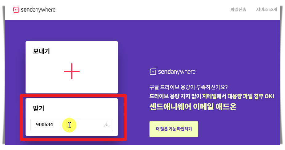 4. 센드애니웨어 홈페이지의 메인화면을 보면 보내기와 받기 영역이 있는데요. 2번 단계에서 폰사진을 선택하고, 얻은 6자리 숫자키를 받기 영역에 입력해 주세요. 그 다음 다운로드 아이콘을 클릭하면 됩니다.