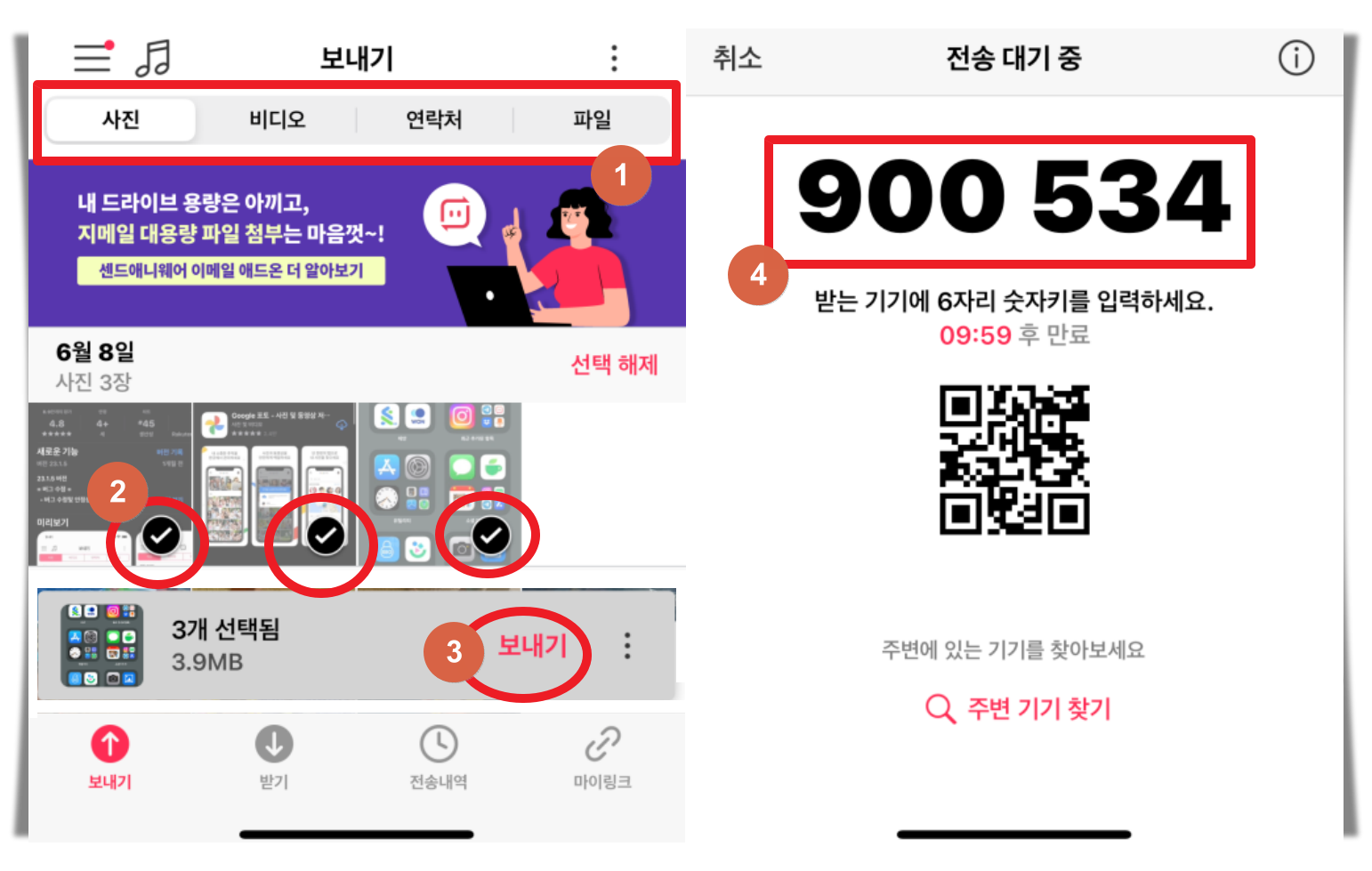 참고로 컴퓨터에서 스마트폰으로 사진을 옮기는 것도 가능한데요. 이 경우에는 메인화면에 있는 보내기 영역을 클릭한 후 옮기고 싶은 파일을 선택해 주면 됩니다. 이 경우에는 스마트폰에서 받기 작업(숫자키 입력)을 진행하면 돼요.
