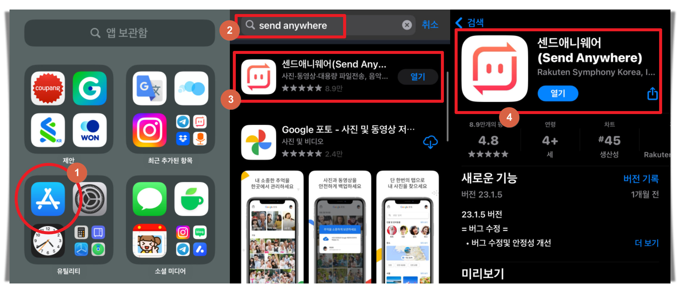 1. 일단 해당 방법을 사용하기 위해 어플리케이션(이하 앱)을 하나 설치해 주어야 합니다. 기능 제한 없이 무료로 사용할 수 있는 앱이기 때문에 부담이 전혀 없습니다. 용량도 많이 차지하지 않아요. 그럼 앱스토어 또는 구글 플레이 스토어를 이용하여 "센드애니웨어" 어플리케이션을 설치해 주세요. "send anywhere"를 검색하면 쉽게 찾을 수 있습니다. 앱 정보를 보면 아시겠지만, 평점이 4.8점으로 매우 높고, 후기가 엄청나게 많은 정도로 많은 사람들이 이용하고 있습니다.