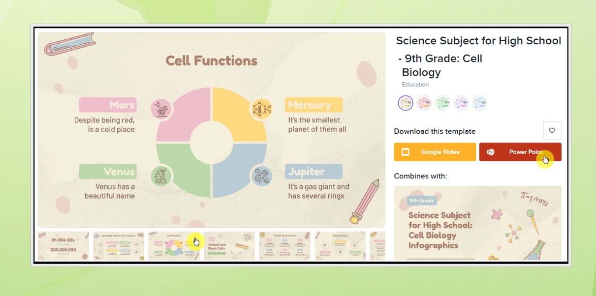 5. 저에게 마음에 드는 PPT 자료를 하나 선택해 보았습니다. 미리보기 화면을 통해 어떤 디자인으로 되어 있고, 슬라이드 구성이 어떻게 되어 있는지 상세하게 살펴볼 수 있습니다. 사이트 화면에서 우측에 보면 디자인의 색 계열을 선택할 수 있는데요. 해당 템플릿의 경우에는 5가지 버전을 제공하고 있네요. 본인이 선택한 자료가 마음에 든다면 우측에 있는 버튼을 눌러서 다운로드 받을 수 있습니다. Google Slides 버전과 파워포인트 버전 이렇게 2가지로 내려 받기 가능해요.