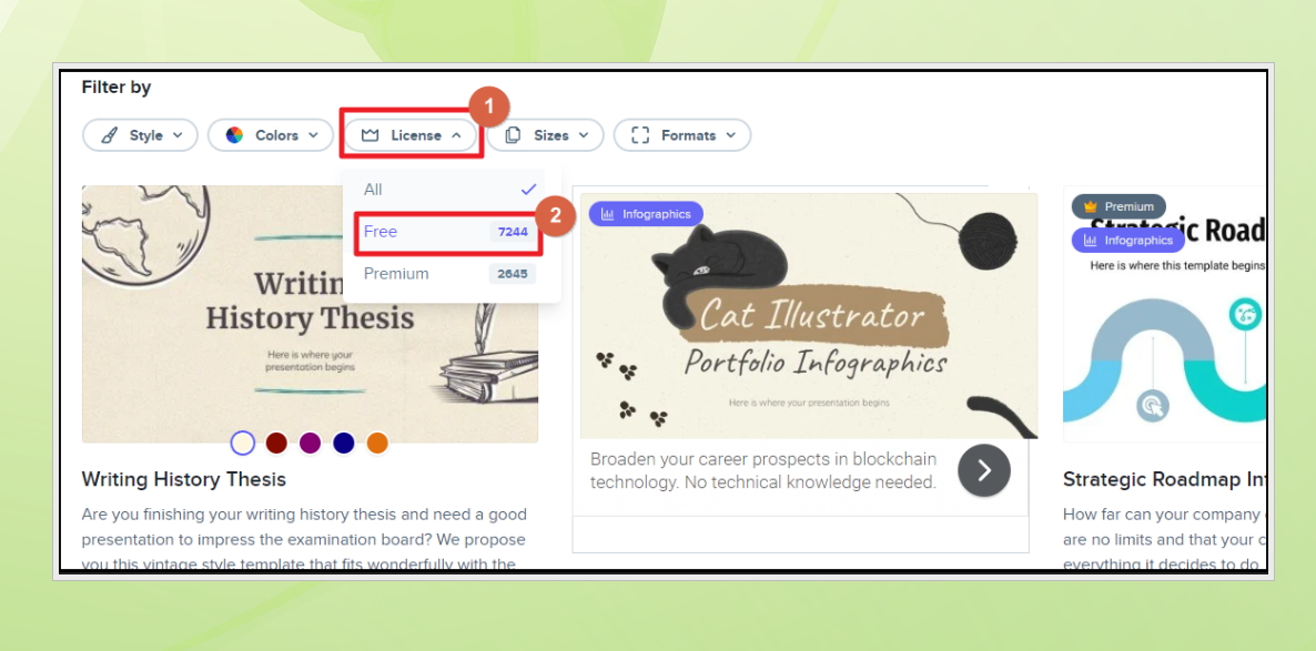 이곳에서 무료로 제공되는 템플릿의 수는 7,244개나 되는데요. 나머지 2,645개는 프리미엄 버전이기 때문에 사용하려면 비용이 발생합니다. 여기서 제공하는 무료 자료만 이용해도 충분하기 때문에 전혀 아쉽지 않습니다.