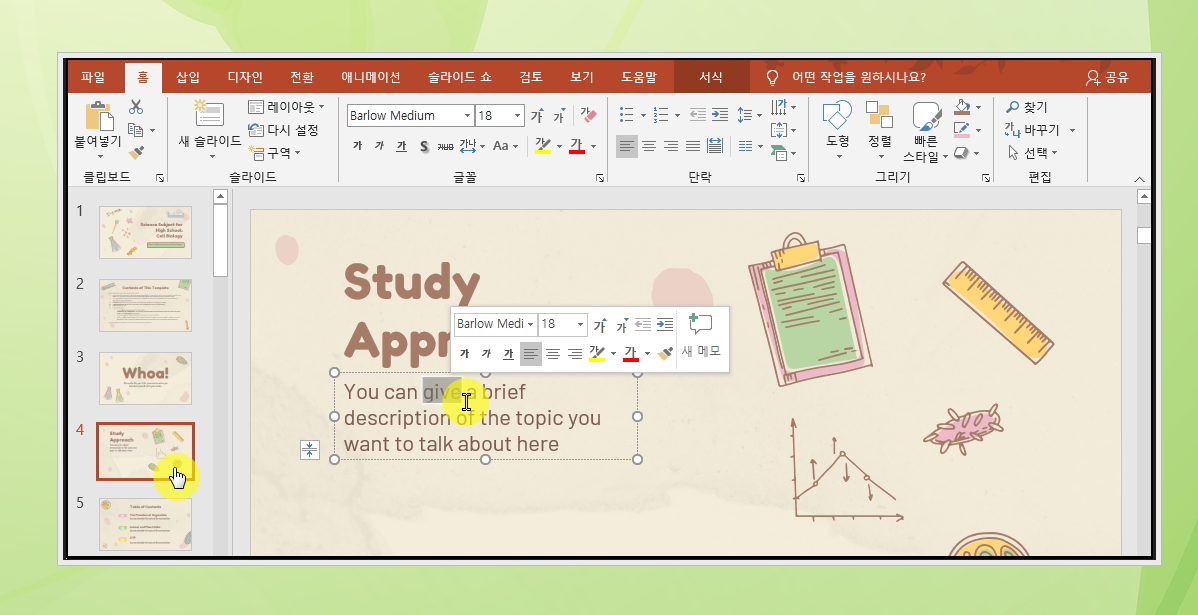 6. 파워포인트를 이용하여 다운 받은 파일을 열어보았습니다. 텍스트 부분을 클릭하면 바로 내용 수정이 가능합니다. 클립아트와 같은 디자인 요소도 클릭하면 위치를 이동 시키거나 크기를 변경하는 것이 가능해요.