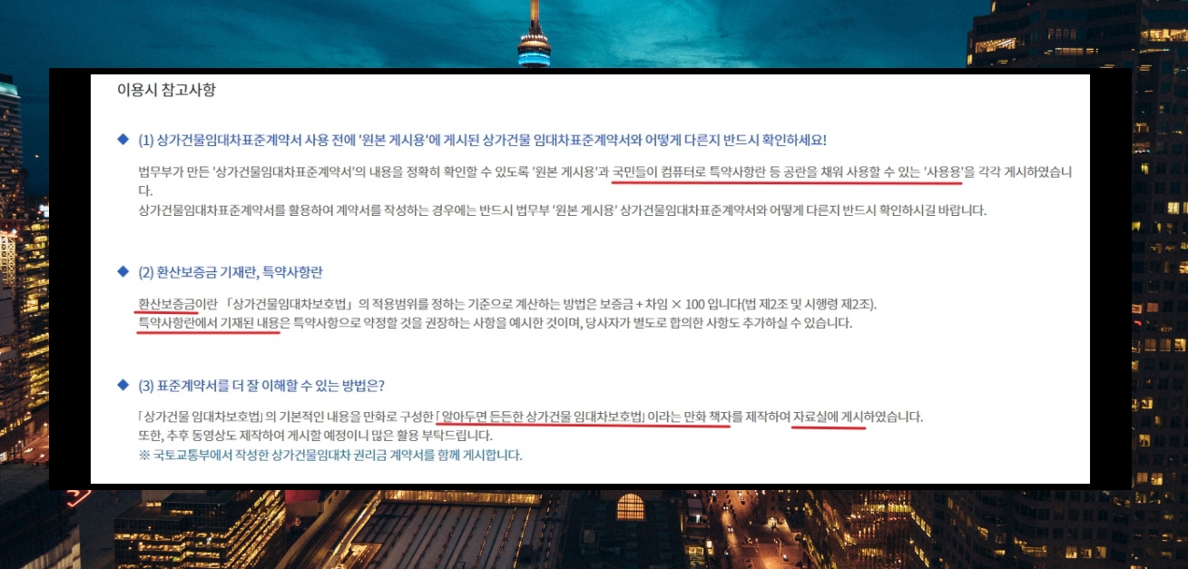 6. 해당 양식을 사용할 때 참고해야 하는 사항도 있는데요. 앞서 언급한 내용에 추가하여 환산보증금 기재란과 특약사항란이 마련되어 있음을 알 수 있습니다. 우리가 무료로 사용하는 표준 계약서를 작성함에 있어서 이해를 도와주는 만화 책자도 마련되어 있는데요. 상가 건물 임대차 법령정보 페이지에서 [자료실] 메뉴를 선택하면 해당 자료를 만나볼 수 있습니다.