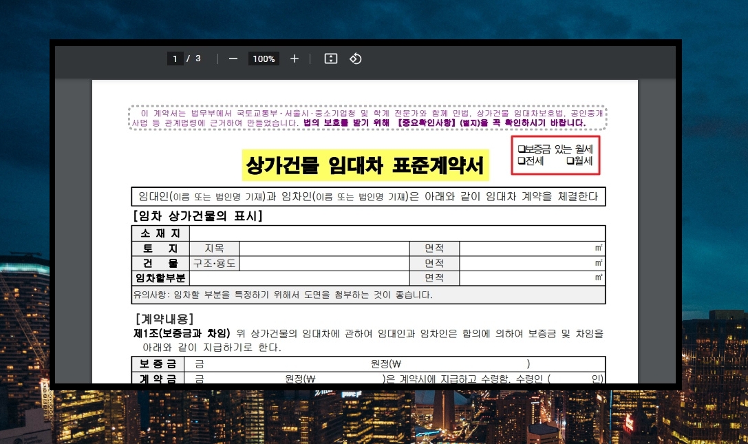 1. 법무부에서는 여러 기관 및 전문가들과 함께 다음과 같은 표준 계약서 양식을 만들었습니다. 보증금 있는 또는 없는 월세, 전세로 상가 임대차를 진행할 때 유용하게 사용할 수 있는데요. 안전하게 계약을 진행할 수 있도록 꼭 있어야 하는 항목은 기본으로 포함이 되어 있습니다. 해당 양식은 법무부 사이트에서 공식적으로 배포를 하고 있는데요. 어떻게 이용하는지 정확하게 알려드리겠습니다.