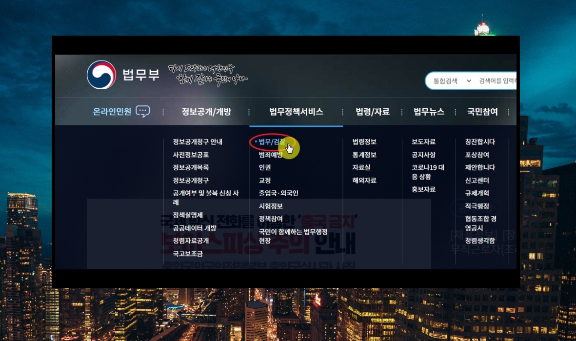 3. 법무부 공식 홈페이지에 접속했습니다. 여러 가지 법무, 법령 관련 서비스와 정보를 제공하고 있는데요. 여기에서 상가 임대차 계약서 무료양식을 받으려면 메뉴에 있는 [법무 정책 서비스]와 [법무/검찰]을 선택하면 됩니다.