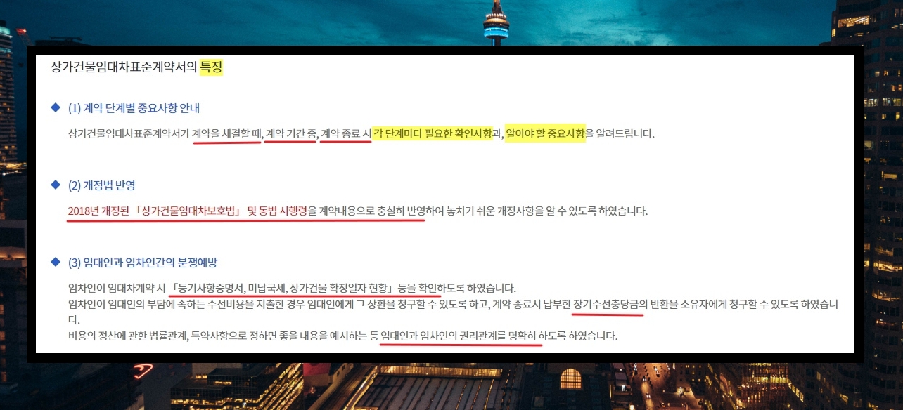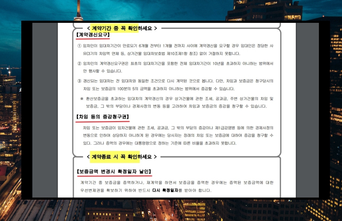 5. 해당 문서를 살펴보기에 앞서 표준 계약서 양식에 대한 특징을 몇 가지 알려드리겠습니다. 일단 여기에는 계약서에 필요한 내용을 기재할 수 있는 항목뿐만 아니라 다음과 같이 계약 체결에서 종료까지 확인해야 할 사항이나 숙지하고 있어야 할 중요사항이 포함되어 있습니다. 이 외에 임차인과 인대인 모두를 보호하기 위한 안정 장치가 마련되어 있기도 하죠.