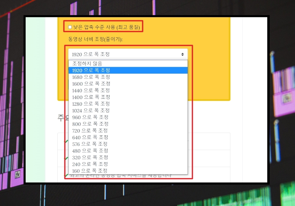 7. 여기서는 옵션 선택이 가능합니다. 화질 저하를 최대한 막고 싶다면 [낮은 압축 수준 사용] 항목을 체크해 주시길 바랍니다. 그 다음 영상 화면의 너비를 조정할 수 있는데, 160에서부터 1920까지 폭 조정이 가능합니다.
