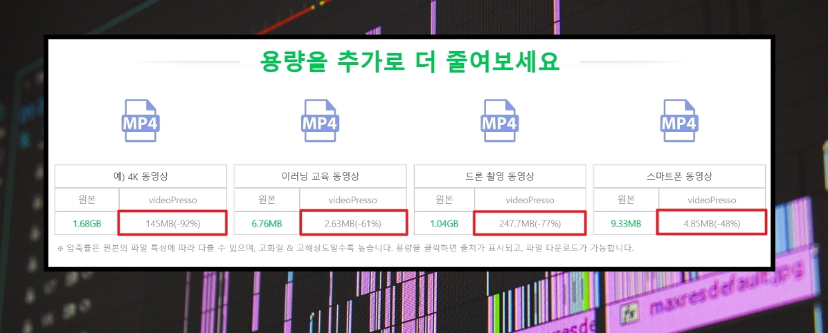 1. 첫 번째 방법을 이용하여 동영상 용량을 줄이는 경우, 다음과 같은 비율로 파일 크기가 축소됩니다. 화질 저하는 거의 없이 영상 파일을 압축할 수 있는데요. 4K, 이러닝교육, 드론촬영영상, 스마트폰으로 찍은 영상 등 다양한 영상 파일을 이곳에서 밥 주기 가능합니다.