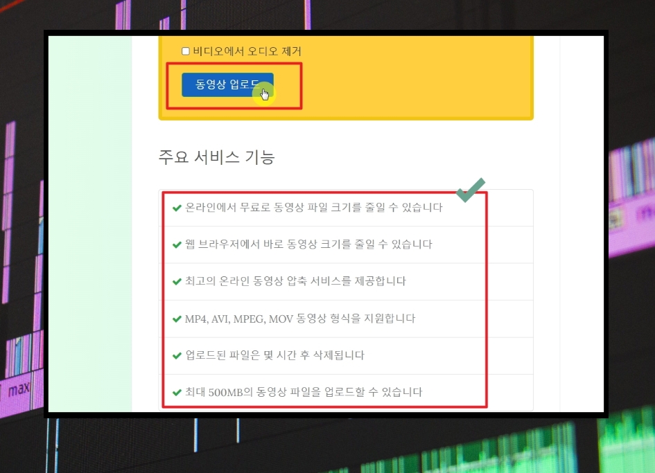 8. 데이터 크기를 축소할 동영상 파일을 선택한 후, 동영상 업로드 버튼을 클릭합니다. 이곳에서 알려 주는 주요 서비스 기능을 한번 살펴보시기 바랍니다. MP4, AVI, mpeg, mov와 같은 동영상 파일 형식을 지원한다고 하오니 이점 참고해 주시길 바랍니다.
