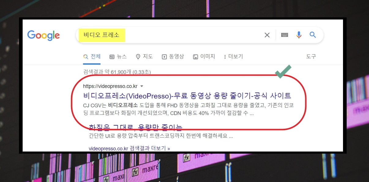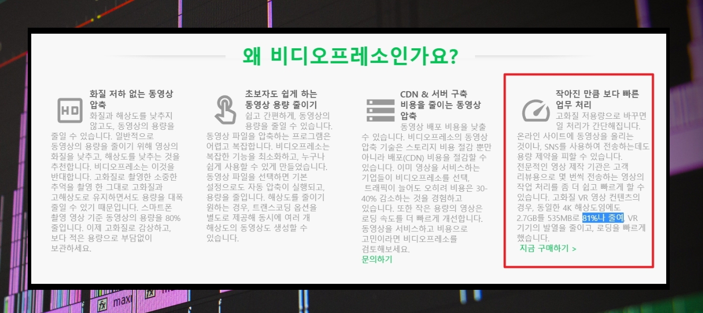 2. 우리가 사용할 첫 번째 사이트는 비디오프레소 입니다. 이곳에서 무료로 동영상 용량을 줄이는 것이 가능합니다. 간단한 검색을 통해 해당 사이트에 접속해 주세요. 참고로 CJ CGV에서는 비디오프레소 도입을 통해서 화질 개선과 용량 축소 이렇게 두 가지 성과를 얻었다고 합니다.