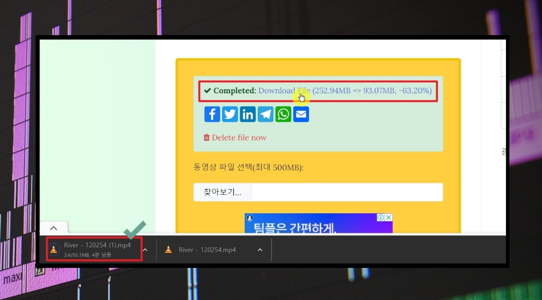 9. 동영상 압축 결과가 나왔습니다. 63%정도의 압축률을 보여 주었네요. 다운로드 파일 버튼을 클릭하면 압축 된 동영상 파일을 컴퓨터로 내려받을 수 있습니다.