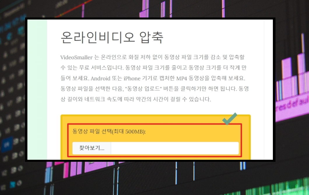 5. 비디오 스몰러 사이트를 이용하는 방법도 첫 번째 방법과 동일합니다. 파일을 올리기만 하면 되는데요. 최대 500메가까지 줄이는 것이 가능합니다. 작업 시간은 영상의 길이와 네트워크 속도에 따라 차이가 있사오니 참고해 주시길 바랍니다.