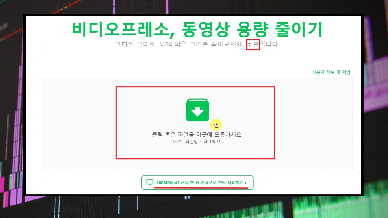 3. 비디오프레소 사이트에 접속했습니다. 안내와 같이 동영상 용량을 줄이는 서비스는 무료로 제공되고 있습니다. 사용법은 간단합니다. 파일을 업로드 하기만 하면 됩니다. 한 가지 안타까운 점은 파일당 최대 100매까지 무료로 진행이 가능한데요. 대용량 파일을 가지고, 축소를 하고 싶다면 파일을 여러 개로 나눠서 비디오프레소의 압축 서비스를 이용하면 됩니다. 비디오 플레이 스토어의 유료 서비스를 이용할 수 있는데요. 커피 한잔 가격 정도라고 하네요.
